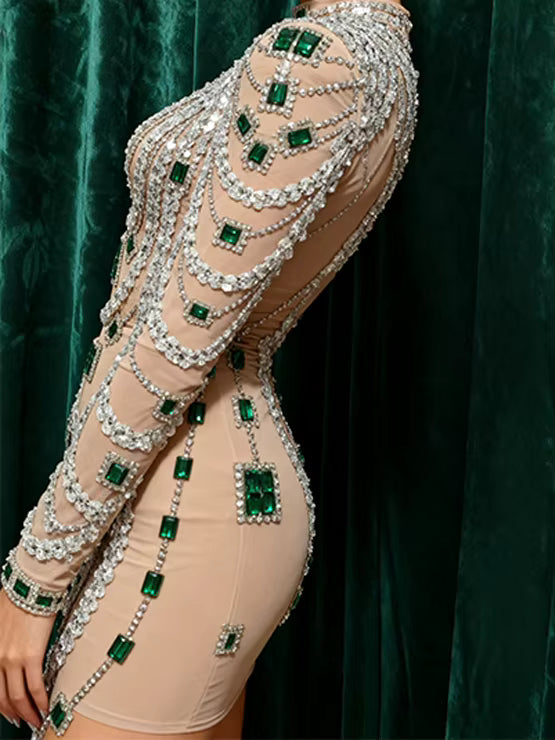 Product Description: Elevate your evening look with this stunning rhinestone-embellished mini dress, designed for those who command attention. Crafted from a sheer, bodycon silhouette, this piece features intricate transparent detailing and sparkling rhinestone accents that catch the light with every movement. Perfect for high-energy venues, celebrity events, or stage performances, the dress combines glamour with contemporary edge. The fitted cut flatters your figure whilst the luxurious embellishments deliver red-carpet sophistication. Ideal for nights when you want to make a bold, unforgettable statement.